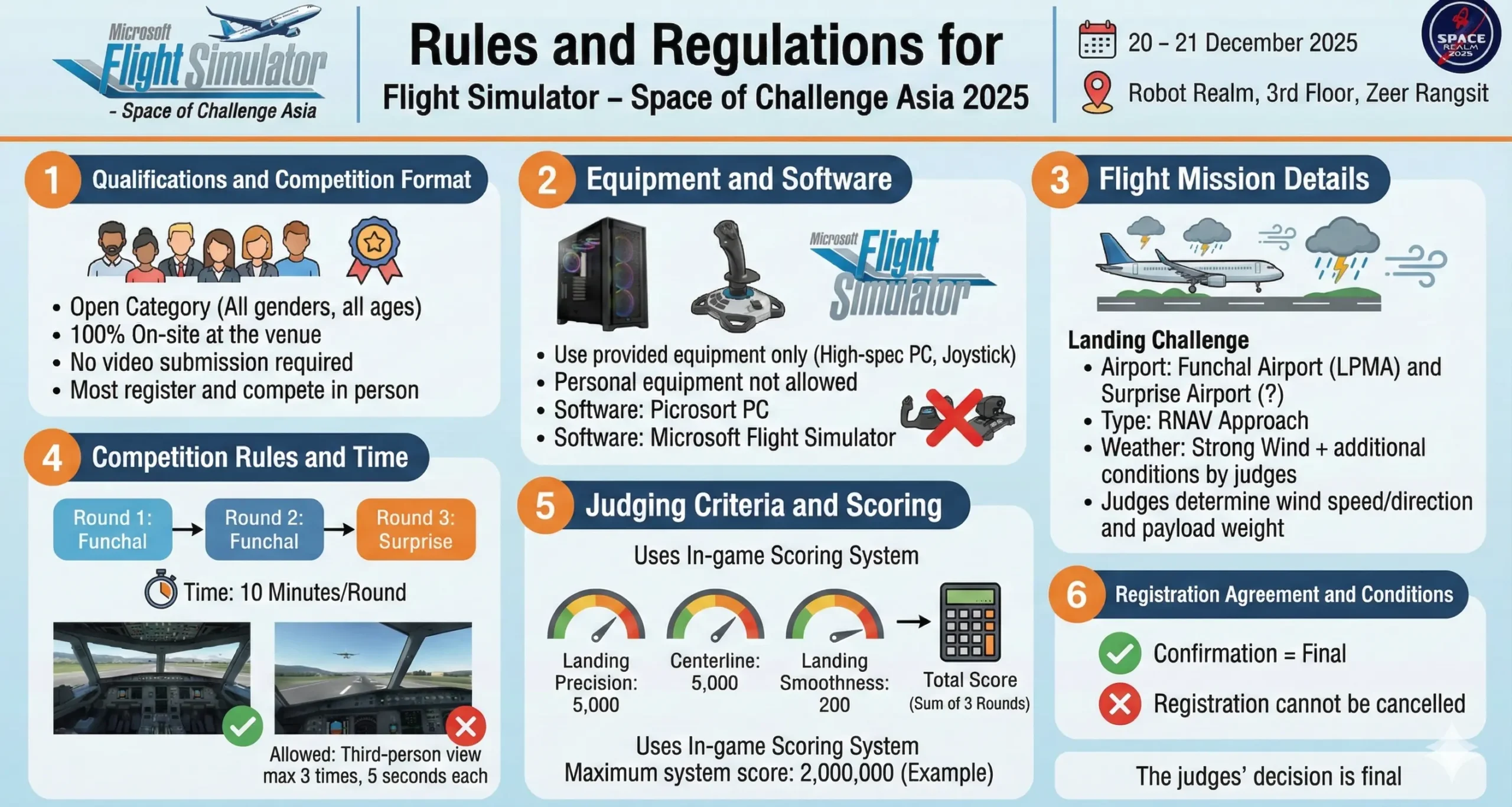 • Hardware: Competitors must exclusively utilize the equipment provided by the organizer (high-specification computer systems). The use of personal peripherals (such as personal joysticks, yokes, or throttles) in the competition is strictly prohibited.